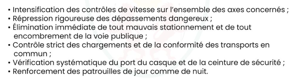 Selon l’officiel, il s’agit de « réduire significativement les accidents de la circulation », mais aussi à assurer « durablement la sécurisation de ces corridors stratégiques essentiel à la mobilité des personnes et au transport des biens ».